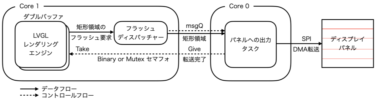 「更新すべき矩形領域」用のメッセージキューと「更新完了を通知」するセマフォを生成し、コア0に「パネルへの出力」を行うflush_task()を追加します。flush_task()